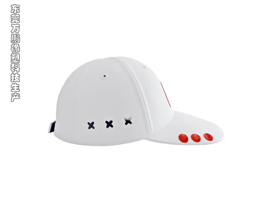 产品采用了IP射出EVA发泡工艺制作生产,通过该工艺使得产品具备不易变形、褶皱等特点,同时不同于普通纺织布产品的是,该产品能够快速水洗使用,不吸水,不用等风干或者晒干的干燥过程。 在产品设计上;帽檐侧边的圆孔设计,可以根据穿戴者的喜好来佩戴一些饰品,起到美观时尚的作用。帽体的顶部和两侧上下分别采取了圆孔式和花纹式的透气孔,使得穿戴时具有更好的透气效果和散热效果,从而降低穿戴时的闷热感,提高清爽舒适感。采取的撕拉粘贴式的大小松紧调节,可以根据自己舒适的穿戴大小进行调节,比传统的扣押式调节更加便捷快速。 同时内部还应用了安全缓冲钉的设计,当穿戴帽子头部受到物理伤害时,缓冲钉可以起到一定的冲击缓冲效果,从而在一定程度上达到降低伤害的作用。因此整个产品的设计即突显了时尚的风格元素又兼备了一定的安全性能。