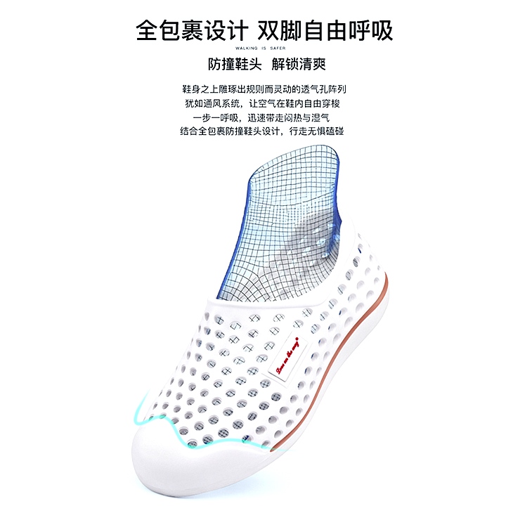 鞋底采用2片防滑橡胶底 包头设计 鞋身多孔透气